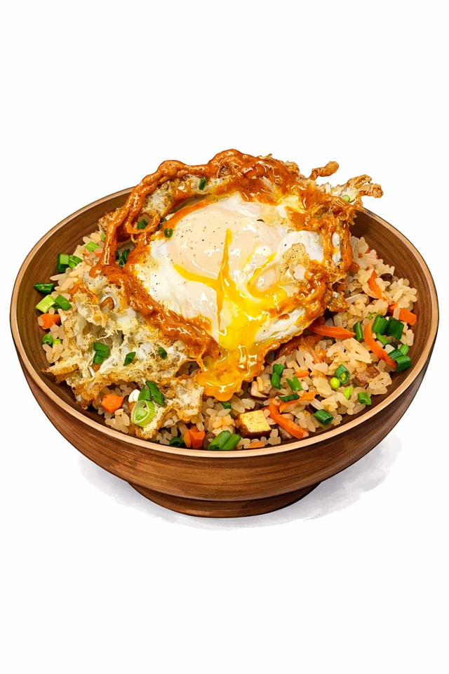 Riz bio sauté aux oignons, carottes et cébettes, accompagné de tofu blanc et tofu fumé bio. Le tout est relevé par une sauce aux champignons, une sauce nuoc-mâm végétarienne, puis surmonté d’un œuf frit et d’une touche de poivre.