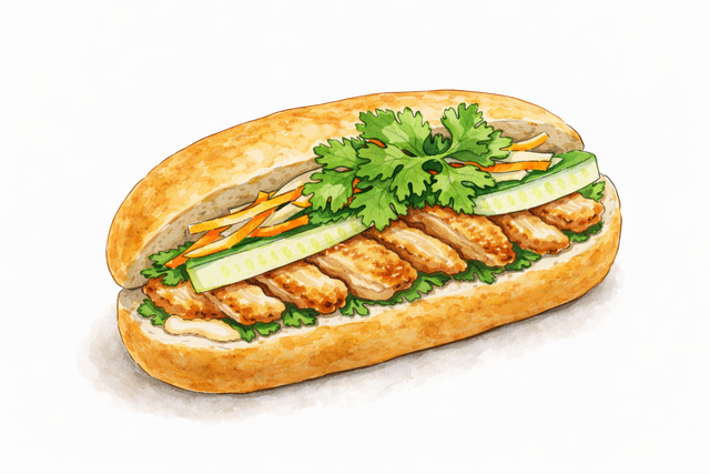Notre encas vietnamien (un quart baguette label rouge), garni de poulet bio mariné, de légumes locaux et/ou bio frais et de notre sauce maison. Ajoutez du piment frais pour un tourbillon de saveurs. (Allergènes : Gluten, Œufs, Soja)